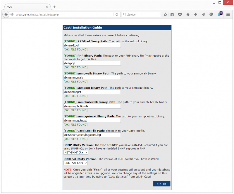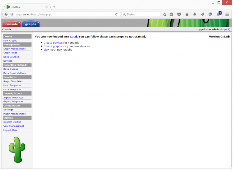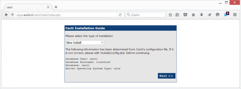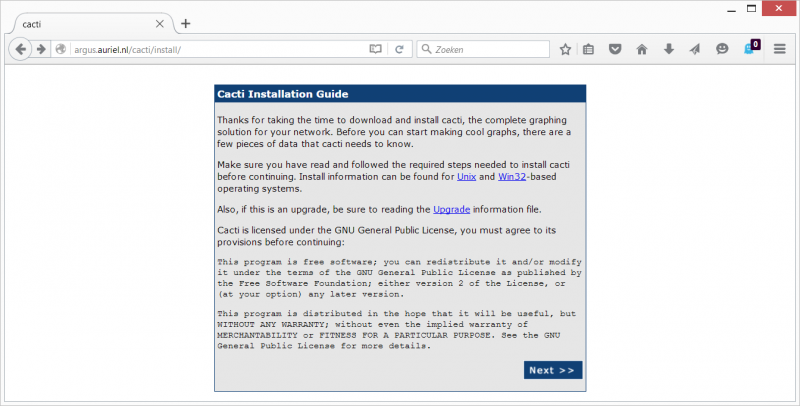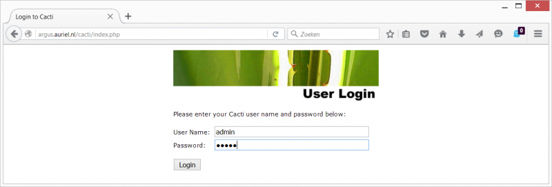 als het klopt kan je nu bij de webinterface. Start een browser en navigeer naar http://server.domein.nl/cacti