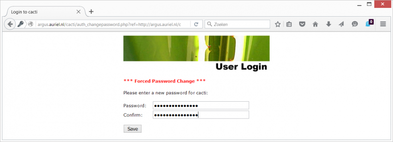de Cacti server is bijna klaar, alleen het admin account moet nog een password krijgen. log als eerste keer in met User Name: admin en Password: admin