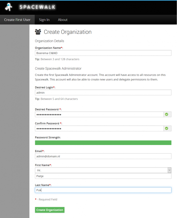 Ga met een een browser naar https://spacewalk.domain.nl . Als je de eerste keer op de website komt wordt je direct gevraagd om een organisatie en een admin gebruiker aan te maken.