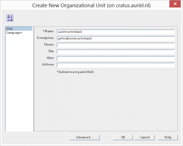 Eenmaal daar kies het tabblad directory, en rechts klick op je domain, in dit voorbeeld auriel en in het pulldown menu kies New > en vervolgend Organizational Unit …