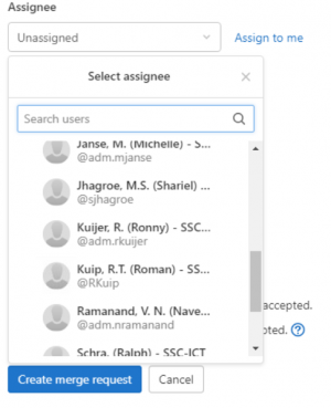 vervolgens assign je de merge request weer aan een andere collega wederom ter controle en om er voor te zorgen dat er als team gewerkt wordt en niet als een “Remy” allerlei wijzigingen door te voeren waar het team later door verrast wordt.