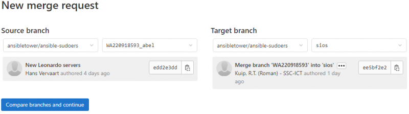 in het volgende venster selecteer sios in het pulldown menu Select source branch Target branch staat meestal al op main druk op Compare branches and continue