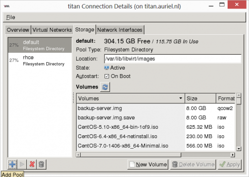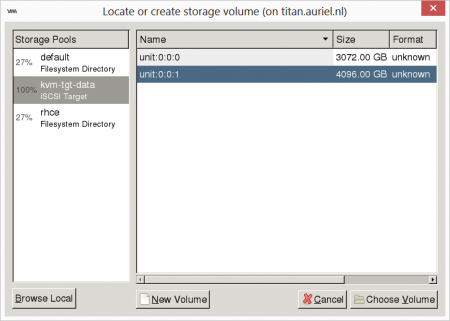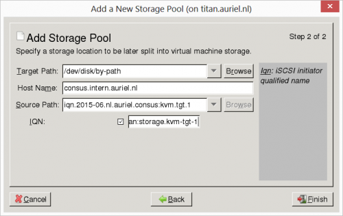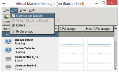 Voeg de iSCSI storage toe als storage pool door in de virt-manager in het menu te kieze voor op edit –→ Connection Details: