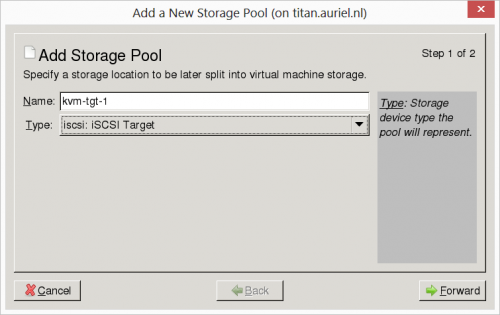 kies een naam voor de nieuwe storage pool en kies als Type: iscsi:ISCSI Target: