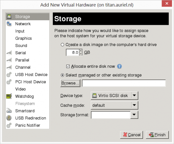 In “add new virtual hardware” kies “storage” vink aan “select managed or other existing storage” en druk op browse, kies als devicetype “Virtio SCSI disk”: