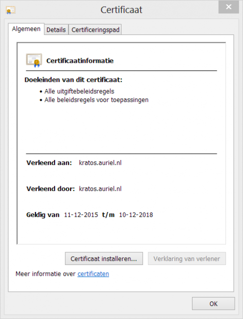 op windows doe je dat door te dubbelklicken op het CA certificaat weat je hebt opgehaald van je CA server. Er verschijnt een venster: druk op Certificaatinstalleren…