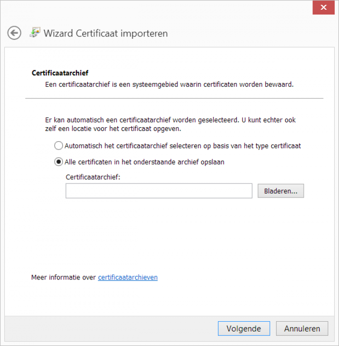 Selecteer ⊗Alle certificaten in het onderstaande archief opslaan en kies Bladeren…