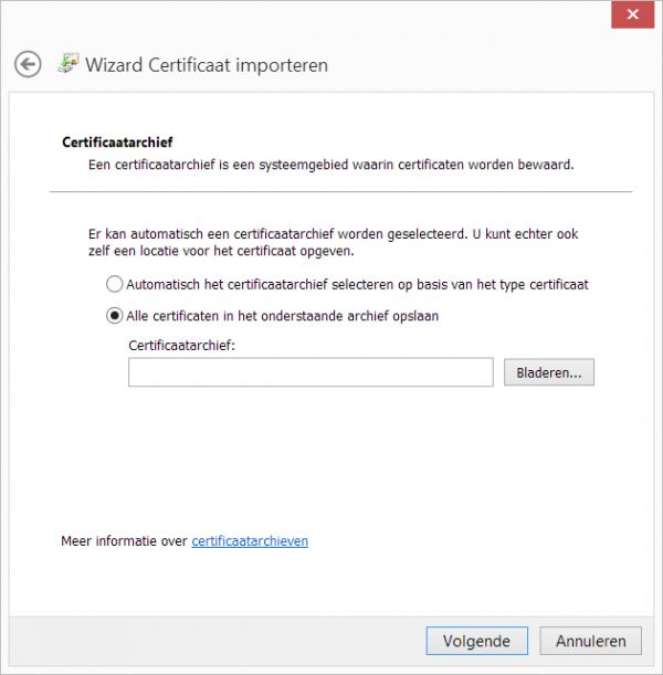 Selecteer ⊗Alle certificaten in het onderstaande archief opslaan en kies Bladeren…
